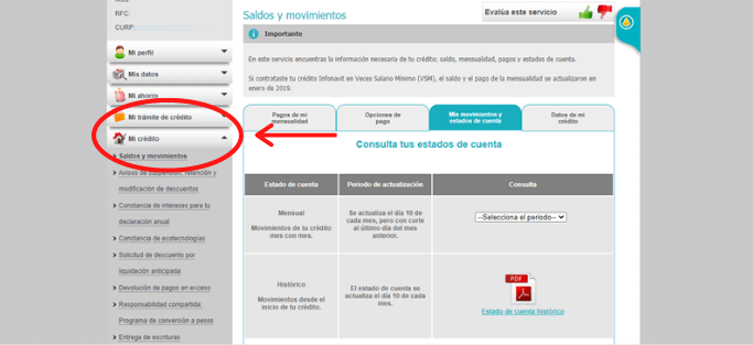 Una vez registrado, debes iniciar sesión en “Mi cuenta Infonavit” e ir a la sección de “Mi crédito”; lo encontraras en el menú de lado izquierdo.