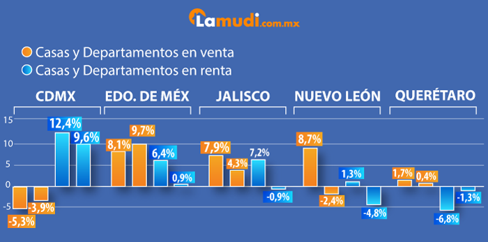 Los estados con mayor demanda residencial como CDMX, el Estado de México, Jalisco, Nuevo León y Querétaro han experimentado estas variaciones porcentuales en cuanto a sus precios promedio.