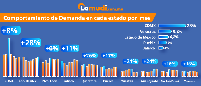 - El Estado de México es la región que ha tenido el mayor crecimiento en las búsquedas inmobiliarias online desde otros estados, con un 28% de crecimiento en el interés.